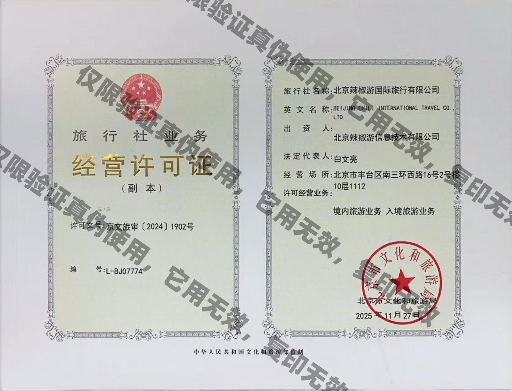 所有旅游业务均由北京辣椒游国际旅行有限公司及旗下分子公司或控股旅行社开展,敬请知晓